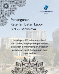 SAJ Consulting adalah penyedia jasa akuntansi & perpajakan profesional yang dapat membantu perusahaan, dan individu dalam mengelola keuangan dan kepatuhan terhadap perpajakan. Dengan pengalaman lebih dari 10 tahun, tim kami memastikan setiap proses akuntansi dapat berjalan transparan, efisien, dan sesuai dengan PSAK serta peraturan perpajakan terbaru.